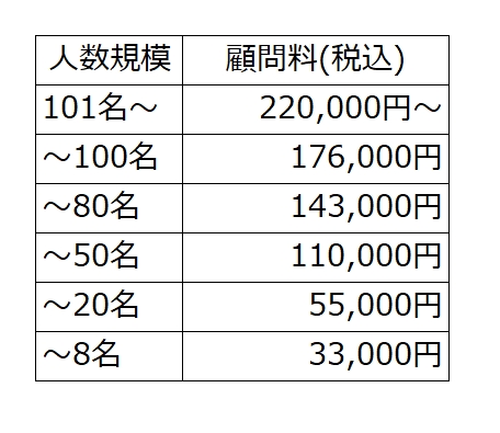 月額顧問料 33,000円~ 会社様の規模、従業員人数、サポート範囲等によりお見積りさせていただきます。
